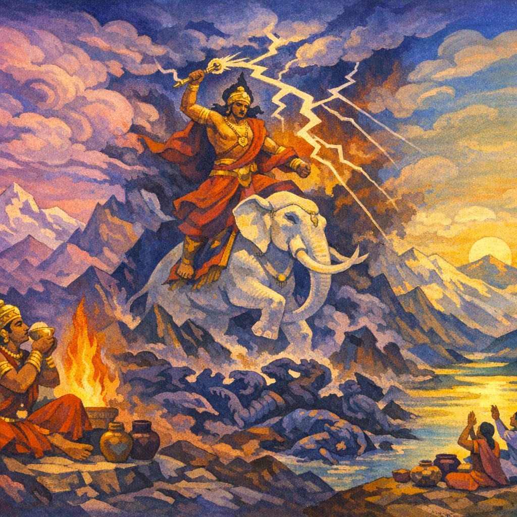 This short Indra hymn praises the god’s innate, birth-born potency: like a young bull he immediately advances to receive and bear the freshly pressed Soma. It recalls his seeking nourishment from the Mother, discerning the sharp power in Soma, and then surpassing all to perform great deeds. The hymn culminates in a battle-prayer, calling Indra the best helper in conflict who smites the Vṛtras (obstructors) and wins wealth and well-being for the singers.