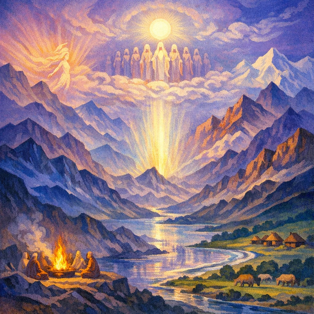 RV 3.55 contemplates how the Many gods are upheld by a single, vast sovereignty (asuratvam ekam) that becomes manifest when Dawn opens the hidden order. Through a chain of symbolic images—Word in the “step of Light,” paired milch-cows, waters and plants, Earth’s plenitude—the hymn praises the inner coherence of Ṛta that empowers the deities and sustains sacrifice and life.