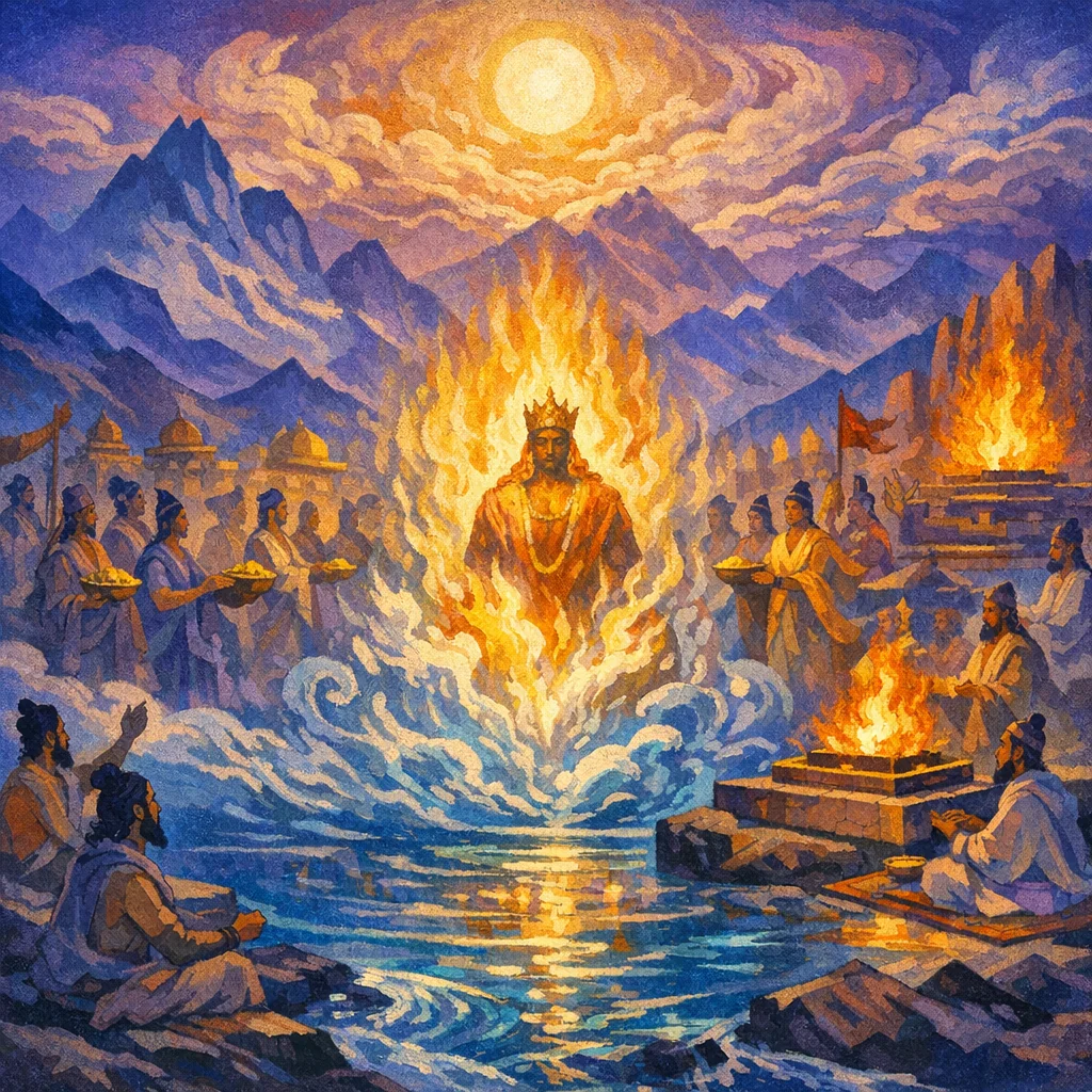 Apām Napāt means “Descendant of the Waters.” In RV 3.9 he is the hidden form of Agni—radiant fire present within the waters—invoked as a powerful helper.