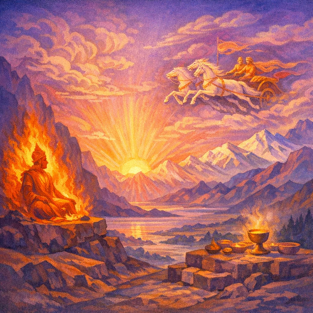 At dawn, fire and dawn-light mirror each other: Agni ‘reveals’ brilliance in the ritual space while Uṣas opens the day in the cosmos, so the hymn treats them as a coordinated awakening.