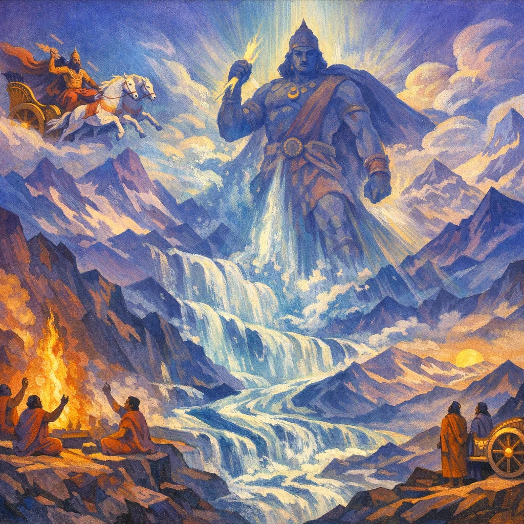 This hymn is an invocation to Indra to come near, sit with the worshippers in the shared rite (sadhamāda), and enlarge their strength, sovereignty, and victorious mastery. It weaves outer yajña imagery—pressing, paths, and the Hotṛ-flame—into an inner psychology of dhiṣā (inspired intelligence) that discovers “go” (light/cows) and receives Indra’s rushing impulse like swelling rivers.