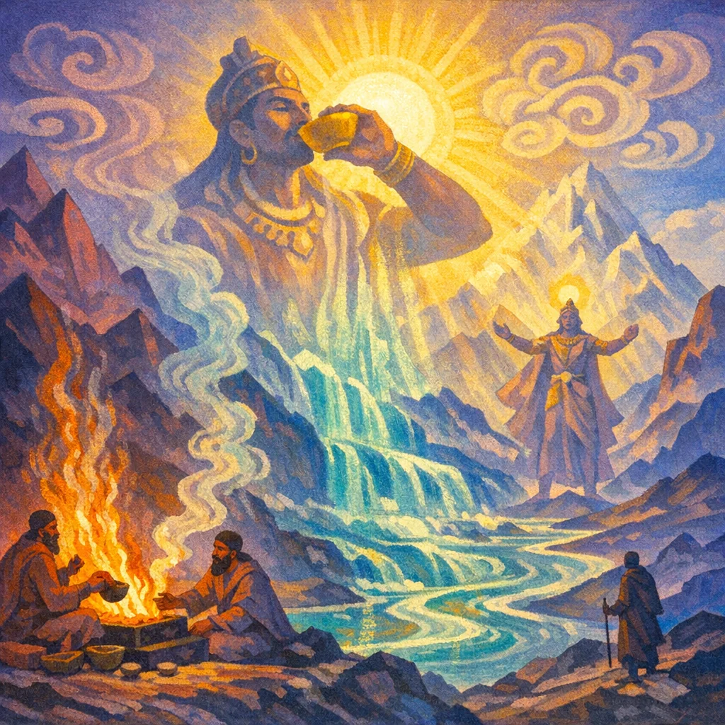 This Triṣṭubh hymn probes the mystery of Indra’s ever-renewed greatness: how he grows by Soma, for whom he accepts the sacrifice, and by what modes he manifests among the singers. Moving through questions, praise, and imagery of swelling power and radiant release, it culminates in a crafted “new brahman” (fresh hymn) asking Indra to increase inspiration and victory for the poet.