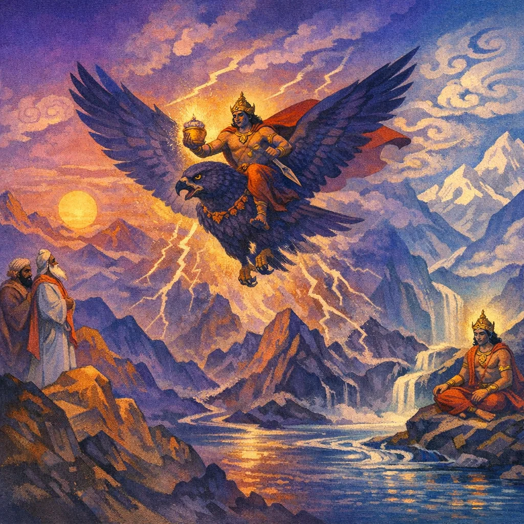 The straight-winged Falcon, offering the pressed shoot, brought the rapturous delight from the far beyond. Holding fast to the god-filled power, he carried Soma down from that higher region of heaven and seized it from the uppermost height—so the ecstasy may enter the human vessel.