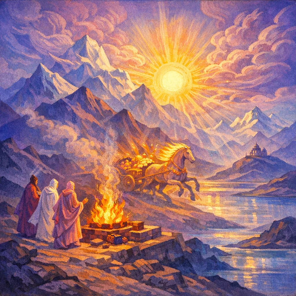 Rich-horsed, bright-charioted you have become—iron-jawed, forceful, bearing the fair prize. O sons of Indra’s might, descendants of Power, may the foremost rapture move in your wake for the ecstasy of the work.