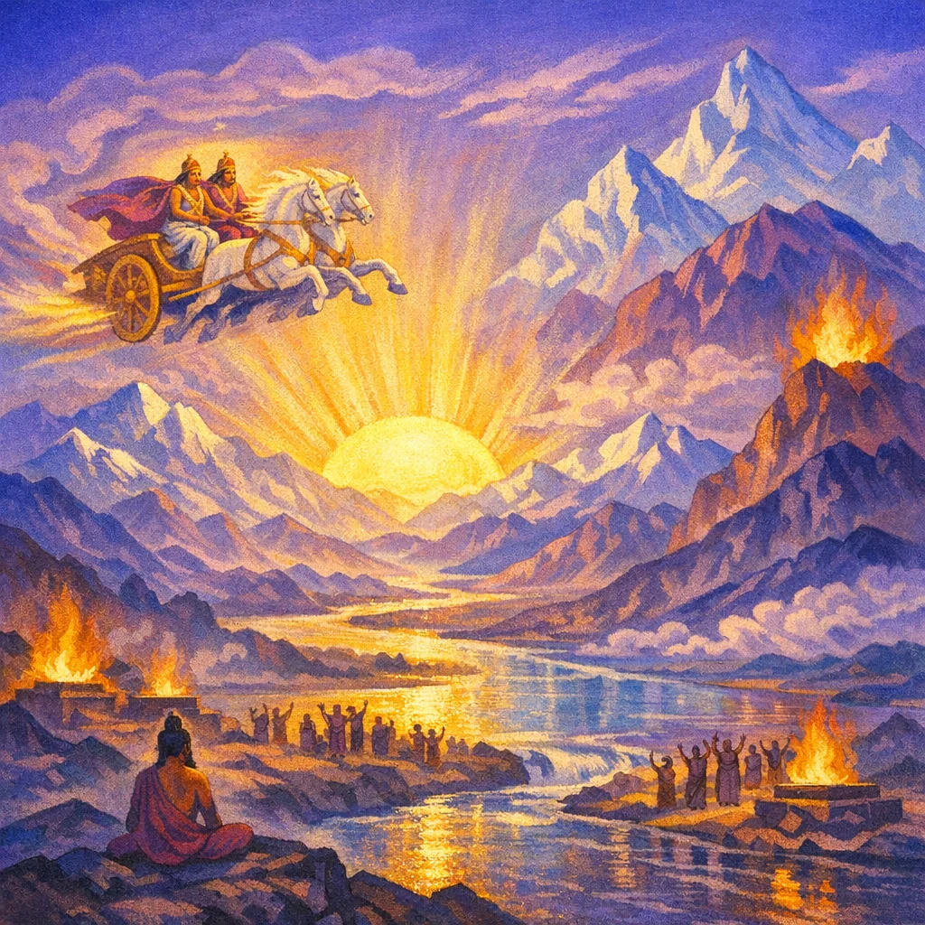 And among them he is the first to surge forward; he weaves down through the ordered lines of the chariots. Making a garland as it were, like a radiant warrior, he scatters the dust in streaming rays—one who has seen and mastered the play of the light.