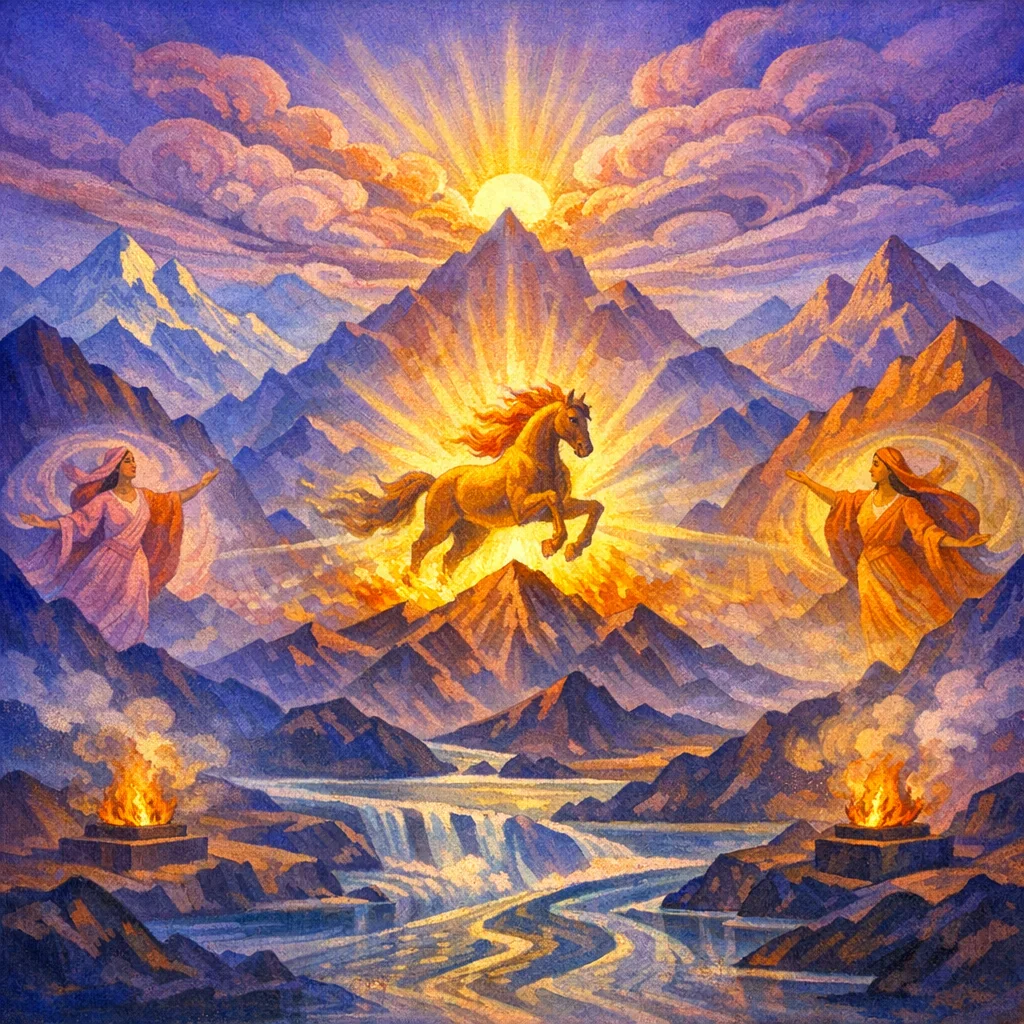 As if calling Indra, both sides invoke, rising up and advancing toward the sacrifice. Mitra and Varuṇa have granted us for the mortal journey Dadhikrāvan, the impelling steed that drives us to victory.