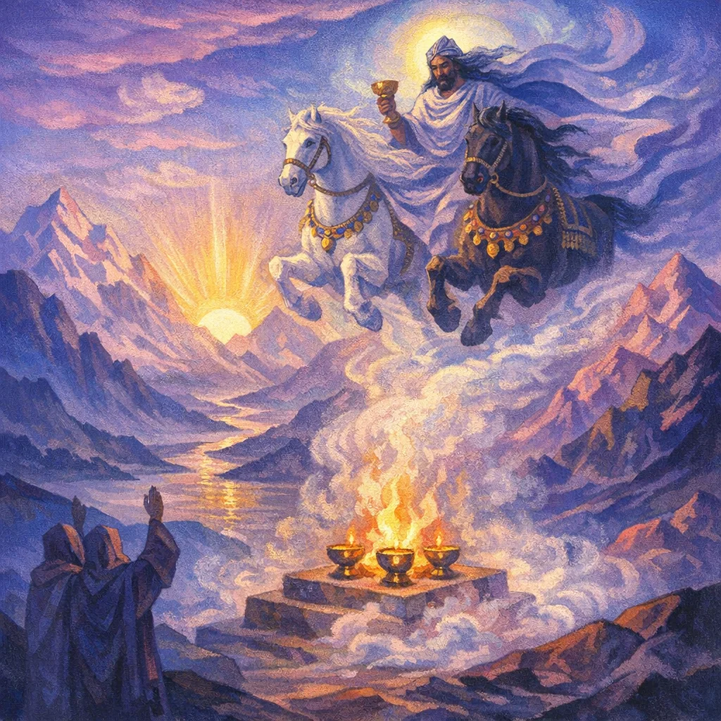 O Vāyu, luminous Power, I bring to you the first essence of delight among the heavenward strivings. Come here to the drinking of Soma—desirable God—yoked with your ordered steeds of force.