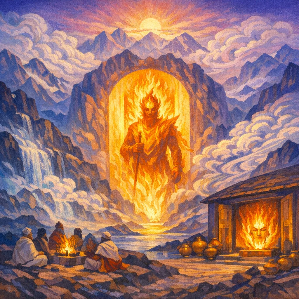 This hymn to Agni Vaiśvānara asks how the sacrificers may rightly offer to the Fire of vast radiance who opens the path by propping apart obstruction. Agni is praised as the revealer of the hidden “word” in the cave and as guardian of the foremost step of the rays (vision), culminating in the vivid image of his shining face blazing within the house (the ritual dwelling and the inner being). Overall, the sukta moves from invocation and praise to a doctrine of revelation—Agni as the force that makes the concealed truth and light manifest.