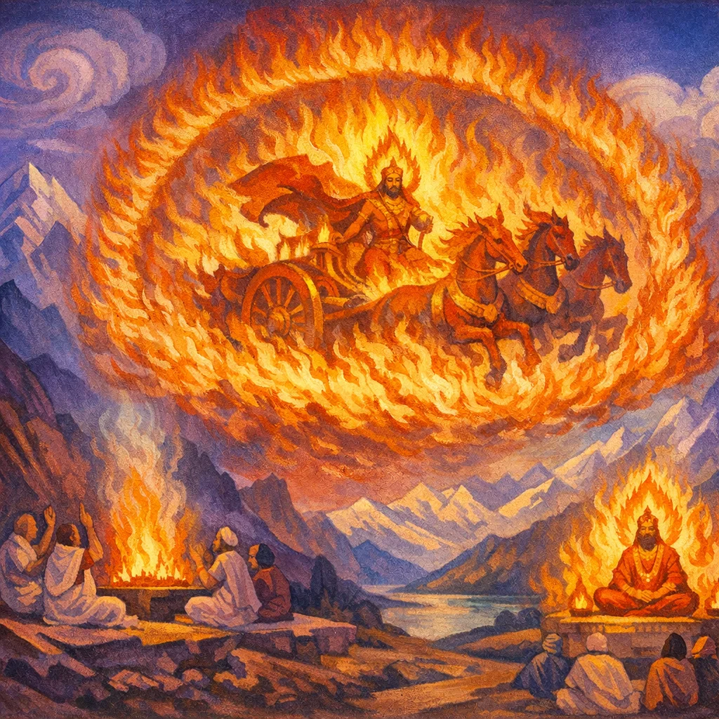 This hymn invokes Agni as the great, gracious presence who comes to the god-seeking community and takes his seat on the sacred grass to establish right communion in sacrifice. Agni is praised as the effective spokesman of the rite—making human offerings truly reach the gods—and as the protector who surrounds the worshipper on all sides with an unassailable defense against harm.