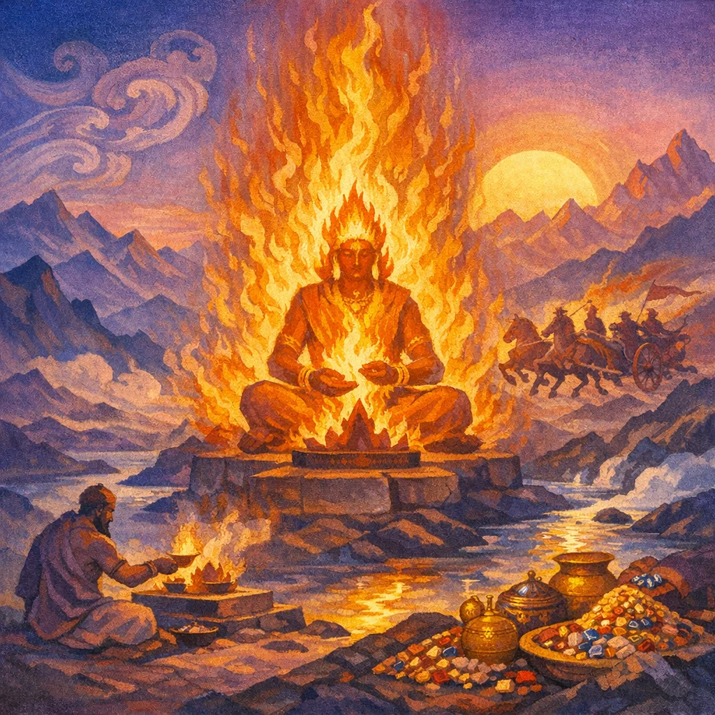 O Agni, in many ways, through you may we attain many riches; O King, may we reach your very state of richness. For many indeed are the wide-giving treasures in you, O Agni—O Wealth itself—belonging to the worshipper, in you the King.