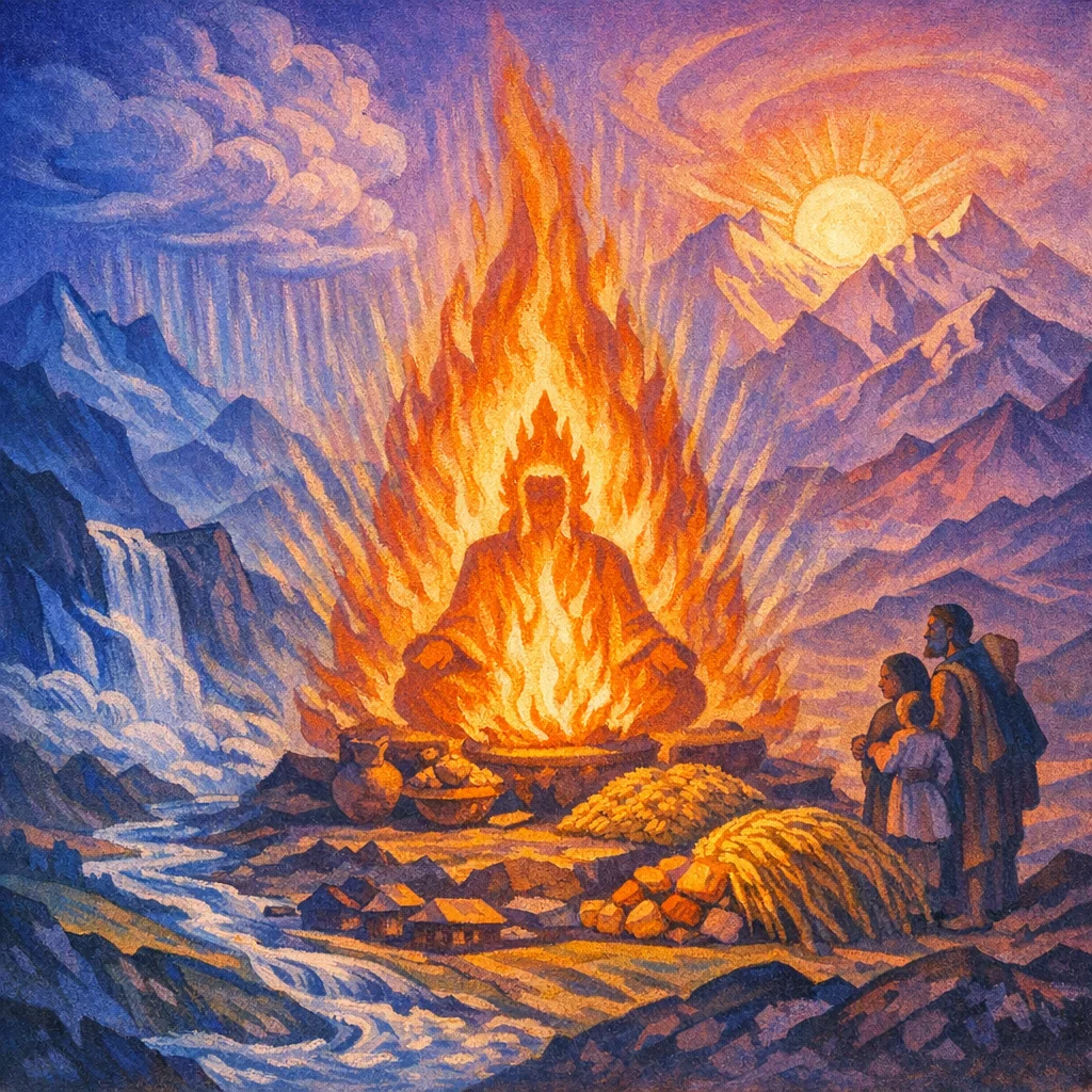 It teaches that Agni is the living source of auspicious powers—prosperity, victory over obstacles, rain, and right order—and that sincere worship at the altar opens the way to success and wellbeing.