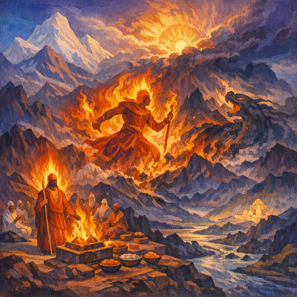 It teaches that Agni is the key priestly power of every sacrifice: he carries offerings to the gods, brings light and prosperity to humans, and destroys forces that obstruct truth and wellbeing.
