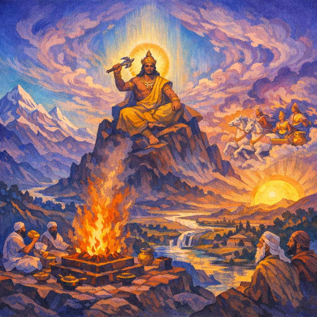 It asks for peace-giving prosperities, rich enjoyments that carry life forward, protection for the worshipper, and “all-desirable” abundance bestowed by Indra.