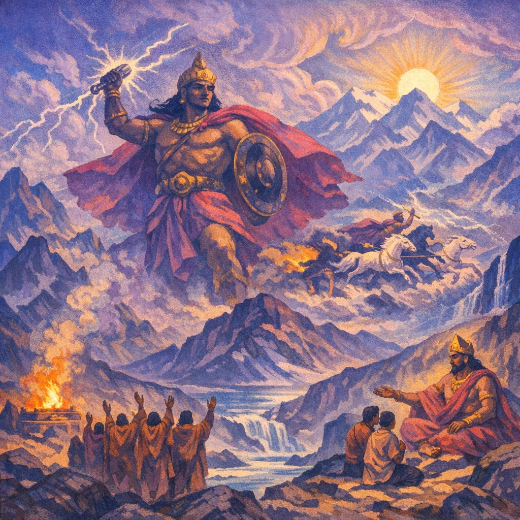 This hymn is a martial and protective invocation to Indra, asking him to hear the Bharadvāja singer and grant fierce help on the “decisive day” when peoples assemble for victory. It recalls Indra’s proven deeds—especially the slaying of Śambara and the protection of Divodāsa—as the grounds for present aid and the winning of strength, cattle/wealth, and sovereign power for the patrons.