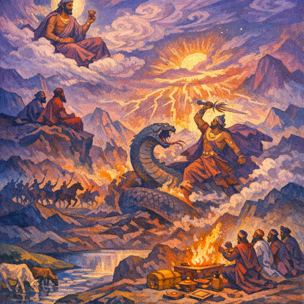 This hymn probes the mystery of Indra’s intoxicating might—how his soma-inspired ecstasy and friendship empower decisive victory in battle. It then recalls concrete heroic exploits (slaying foes such as Śeṣa and the Vṛcīvant) and culminates in a priestly, ritual setting where royal patrons grant generous dakṣiṇā, linking Indra’s power with prosperity and patronage.