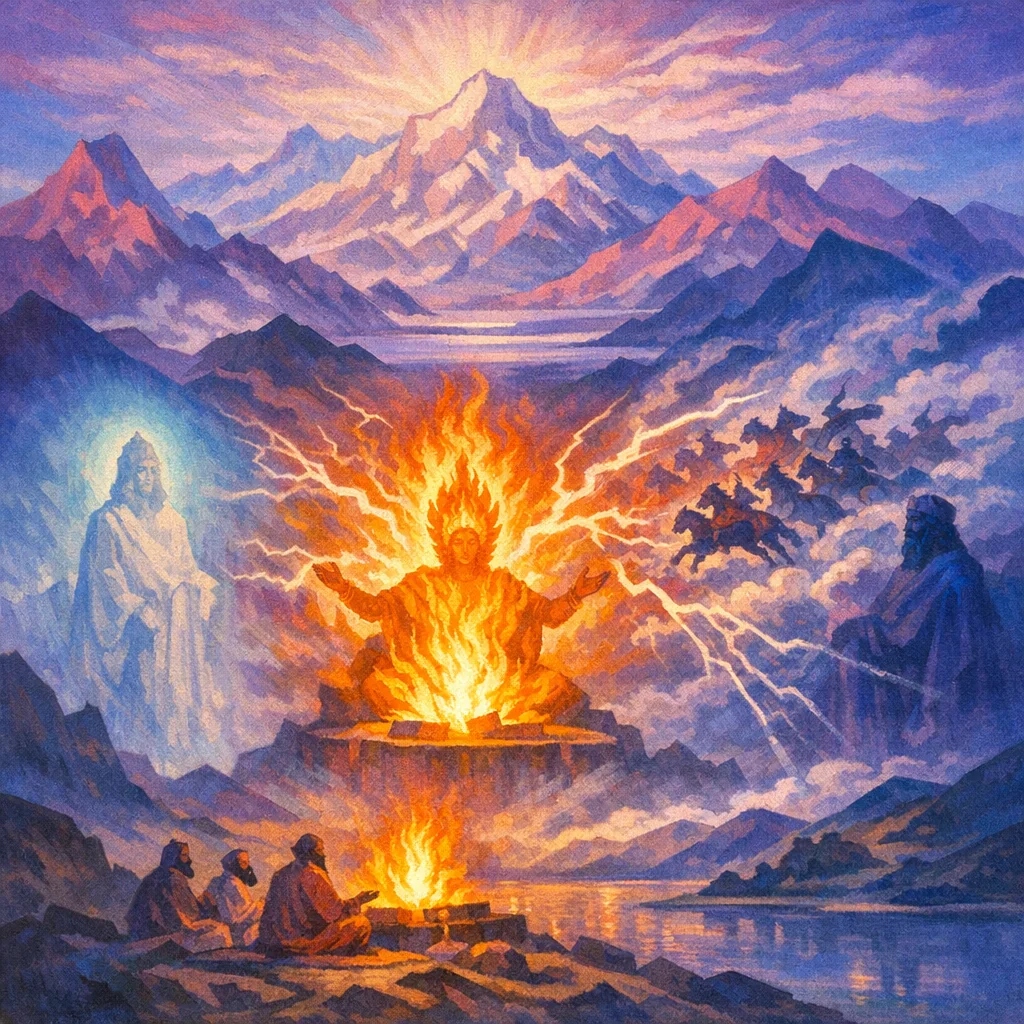 This hymn praises Agni as the guardian and embodiment of ṛta (cosmic truth), the power that leads the seeker to “wide light” and protects the mortal from narrowing distress. Agni is celebrated both as the swift, shining force that moves through night like a bird and as a lightning-like brilliance empowered by hymns, working in accord with Mitra–Varuṇa to uphold order and safety.
