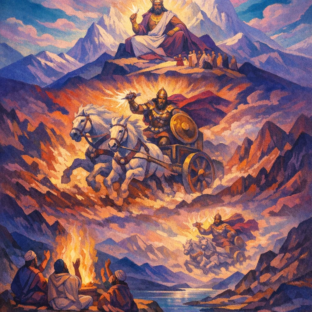 This short Indra hymn praises him as the singular lord of riches who holds the peoples in his hands and is acclaimed across home, waters, offspring, and the Sun. It recalls his heroic victories with Kutsa against Śuṣṇa and other obstructers in the quest for the cows/light, and ends by urging Indra to mount his chariot, come by the wide paths, and make the worshipper’s call effectively heard.