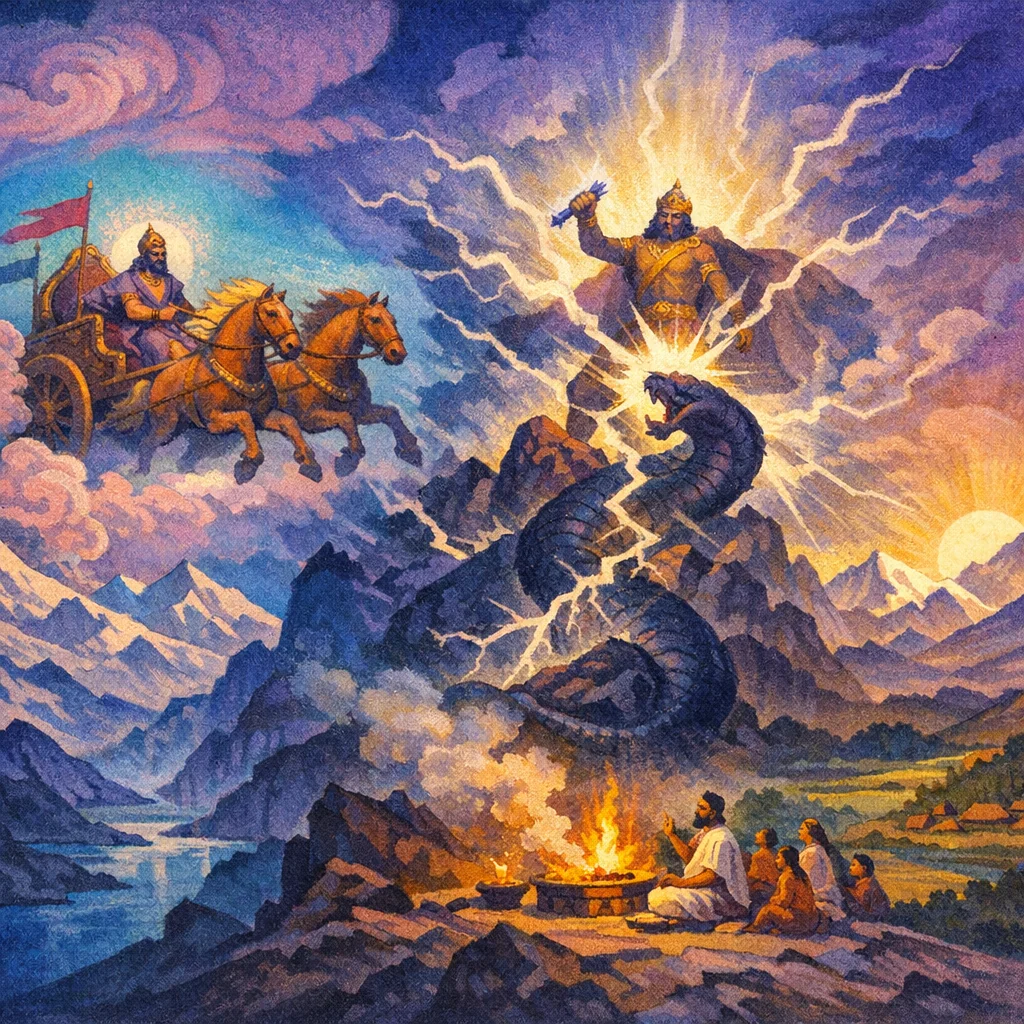 Vṛtra is the ‘Coverer’ or obstructing force; Indra’s slaying of Vṛtra means breaking what blocks light, flow, success, and inner progress.
