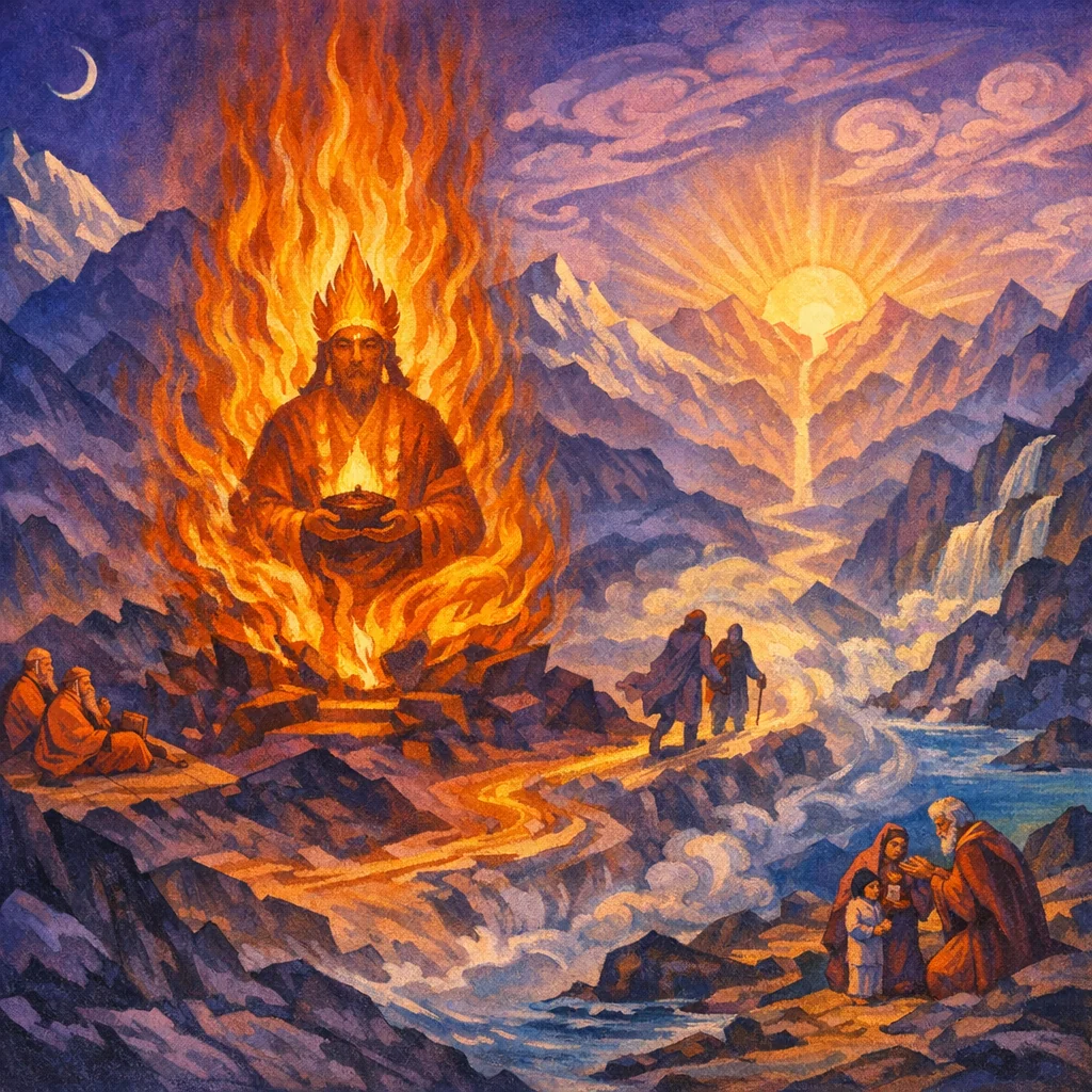 Manu represents the archetypal founder of yajña. The hymn asks Agni to perform for the present worshippers in the same correct, powerful way as he did in Manu’s model sacrifice.
