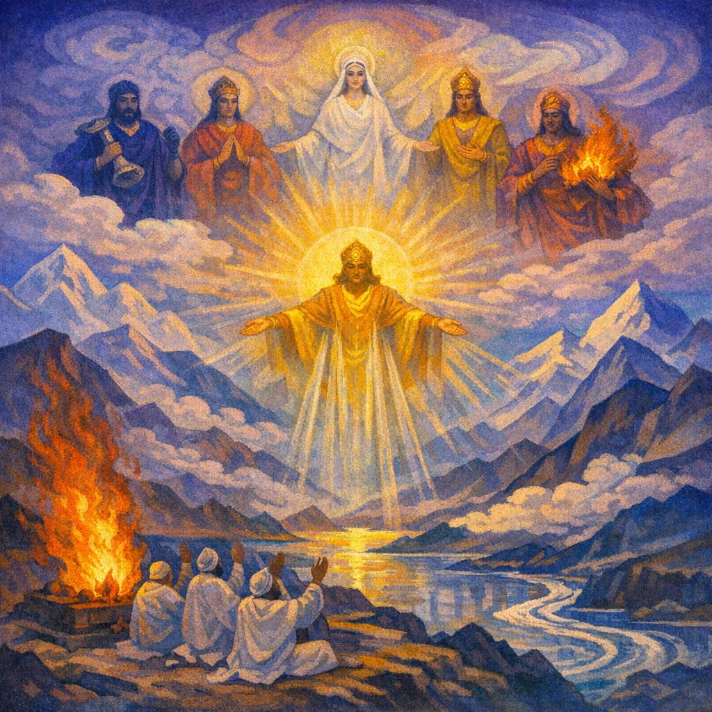 Savitṛ is invoked as the protecting, “golden-handed” power who sets good actions in motion and “unfolds” desirable riches for the person who offers and lives rightly.