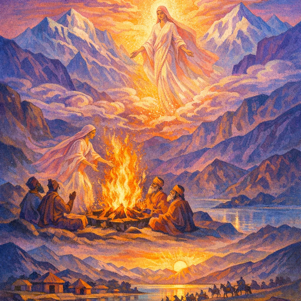 This is she—our Heaven-born Daughter—rising, she has awakened the human habitations. She who, with her shining beam in the beautiful fields, is born beyond even the nights of darkness.