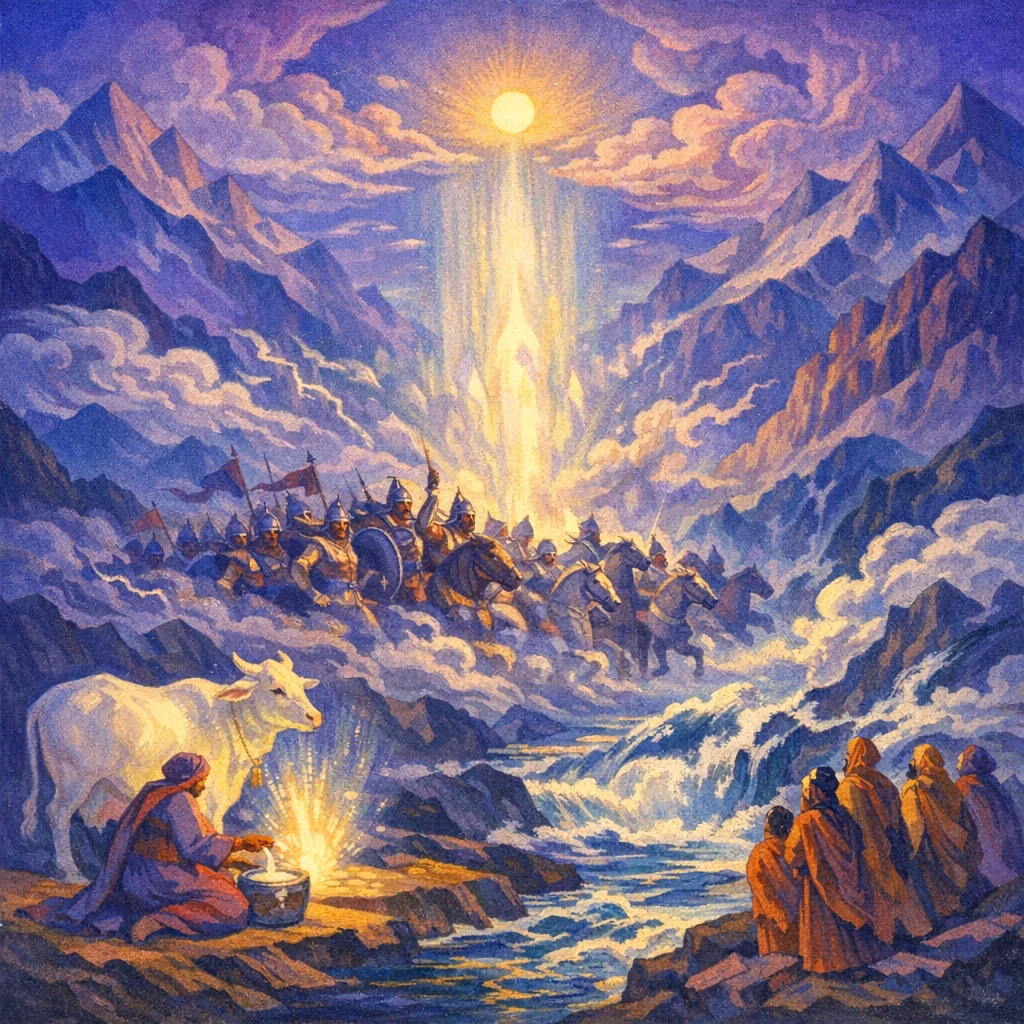This hymn praises the Marut-host as Rudra’s fierce, radiant sons—storm-gods whose rushing power shakes and “yokes” the two worlds, heaven and earth. Through the imagery of Pṛśni as the abundant Cow-mother, the poet evokes their birth, nourishment, and their bright essence released for the benefit of mortals. The sukta’s purpose is both laudatory and invitational: to draw the Maruts to the sacrifice so their force, protection, and victorious impetus may empower the worshipper.
