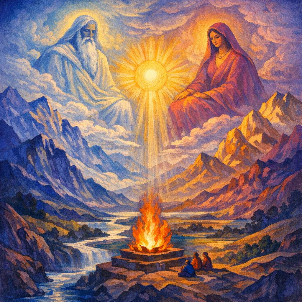 Dyāvāpṛthivī are Heaven and Earth addressed together as a divine pair—Father and Mother—who support all life and provide the stable space in which the sacrifice and the world can function.
