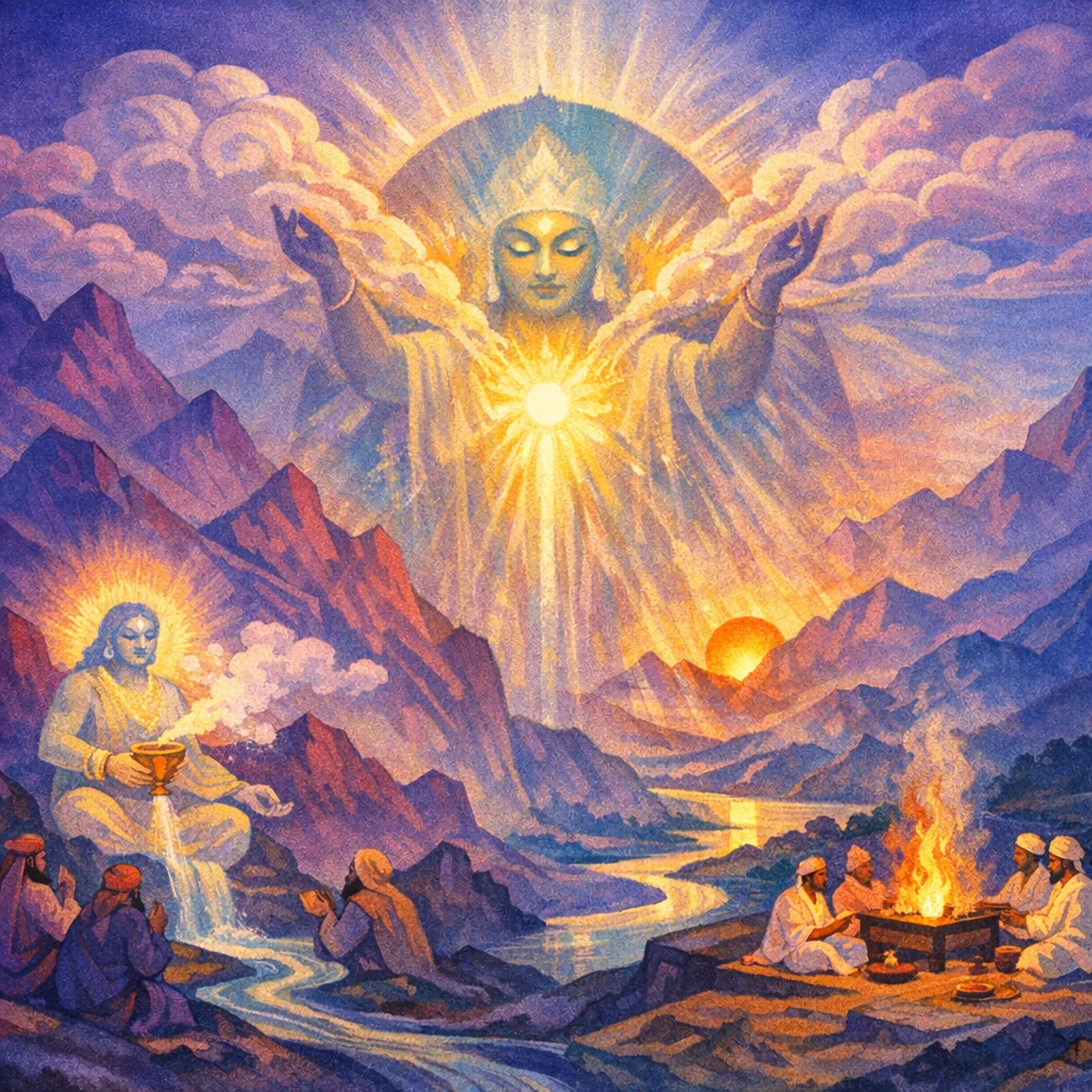 This Soma Pavamāna hymn praises the purified Soma as a growing, luminous power that impels the “shining thought of Ṛta” and makes the sacrifice advance. Soma is portrayed as beloved and all-pervading, harmonizing the gods under one law (vrata) and opening the “pen of heaven,” releasing light and order into the ritual and the world.