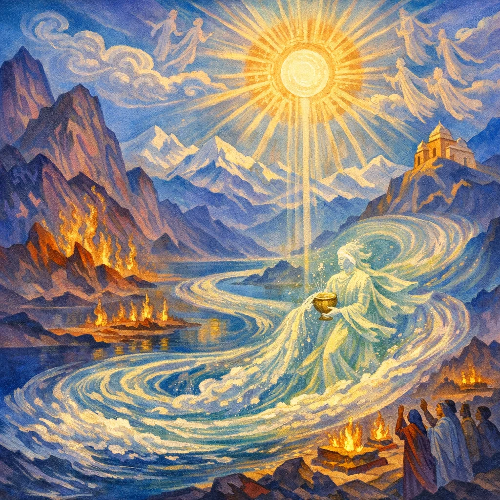 This Soma Pavamāna hymn celebrates the purified Soma as a seer-like power moving upon the cosmic waters, bearing inspired speech and awakening both heavenly and earthly realms. Through repeated cleansing, Soma becomes radiant, wins the “cows” (rays/illumining powers), and is invited to come to the sacrificer bringing vasu—riches of light, force, and well-being.