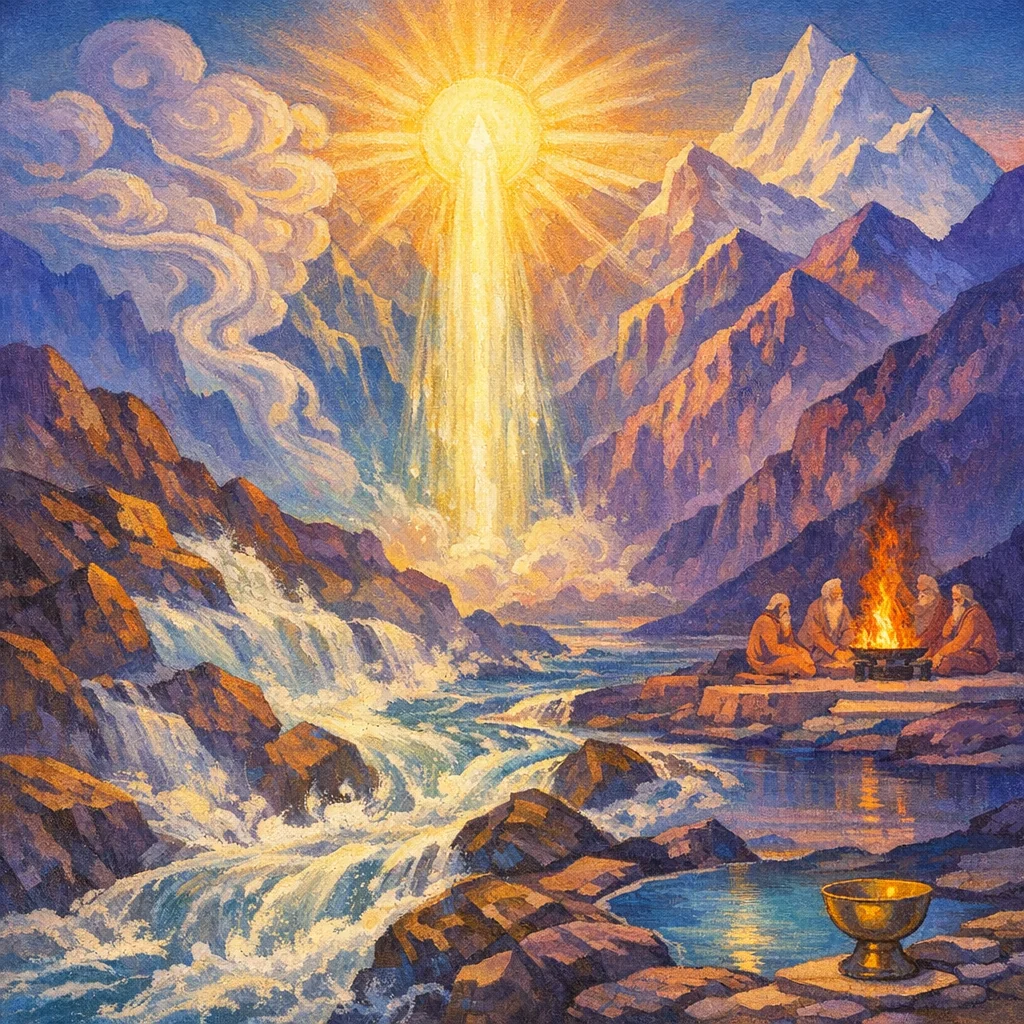 This Pavamāna Soma hymn celebrates the pressed Soma as it rushes forward like a river, smashing obstacles and purifying itself through the filter on its way to the gods. Soma is praised for ascending beyond the “three luminous realms,” shining with a sun-like impulse that drives light and vitality forward. The hymn culminates in inviting the sweet, potent stream to take its seat in the shared ritual space, beautiful for ṛta (truth/order) and fit for divine drinking.