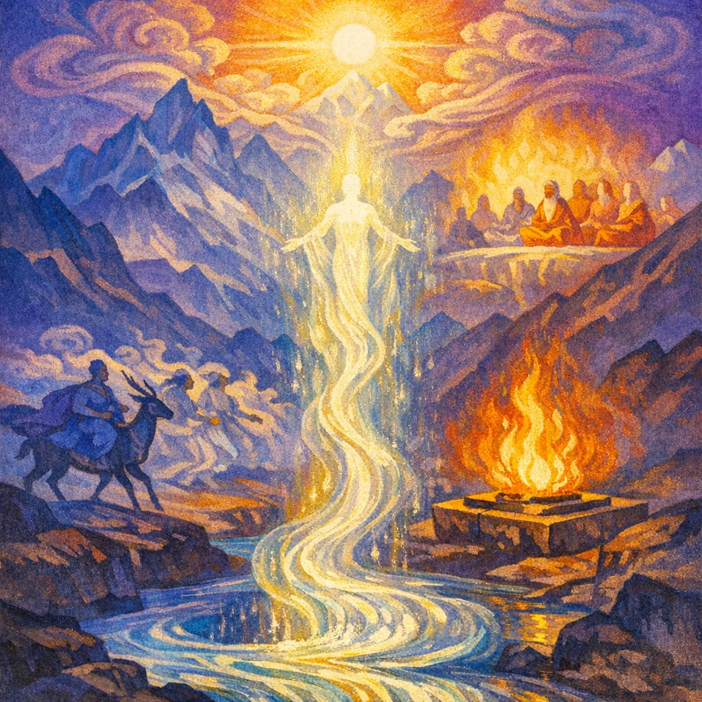 This short Pavamāna Soma hymn invokes Soma to purify himself through the filter (pavitra) and become the exhilarating drink for the Gods, especially the Maruts and Vāyu. As he is strained, Soma is praised as the accomplisher of inspired discernment (dakṣa) who pervades “all forms” and moves toward the realm where the deathless ones abide. The hymn’s purpose is both ritual—consecrating the pressed Soma for offering—and mystical—describing Soma’s ascent into the luminous womb of sacred song (arka).