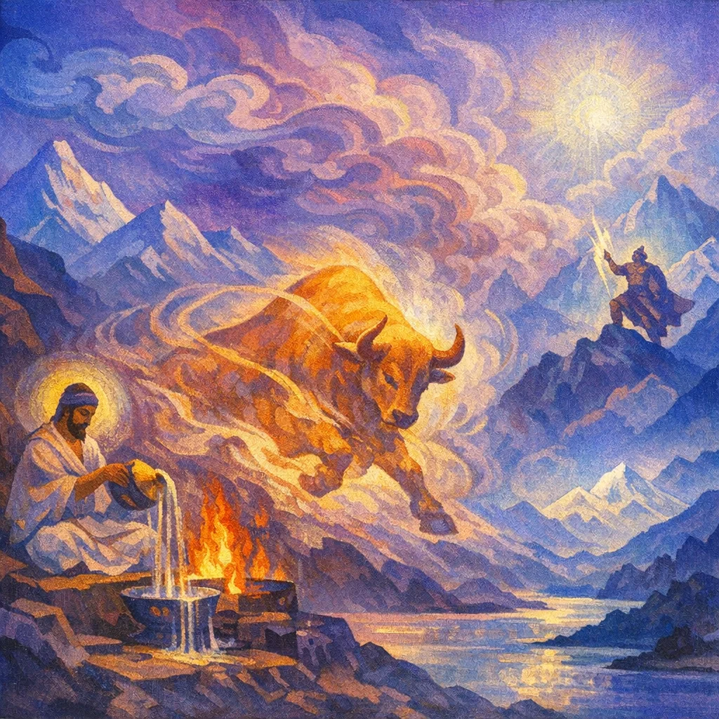 This mighty one speeds and presses forward in the mid-region, the Bull, the tawny force; the purifying Indu moves toward Indra, to strengthen the lord of luminous power within us.