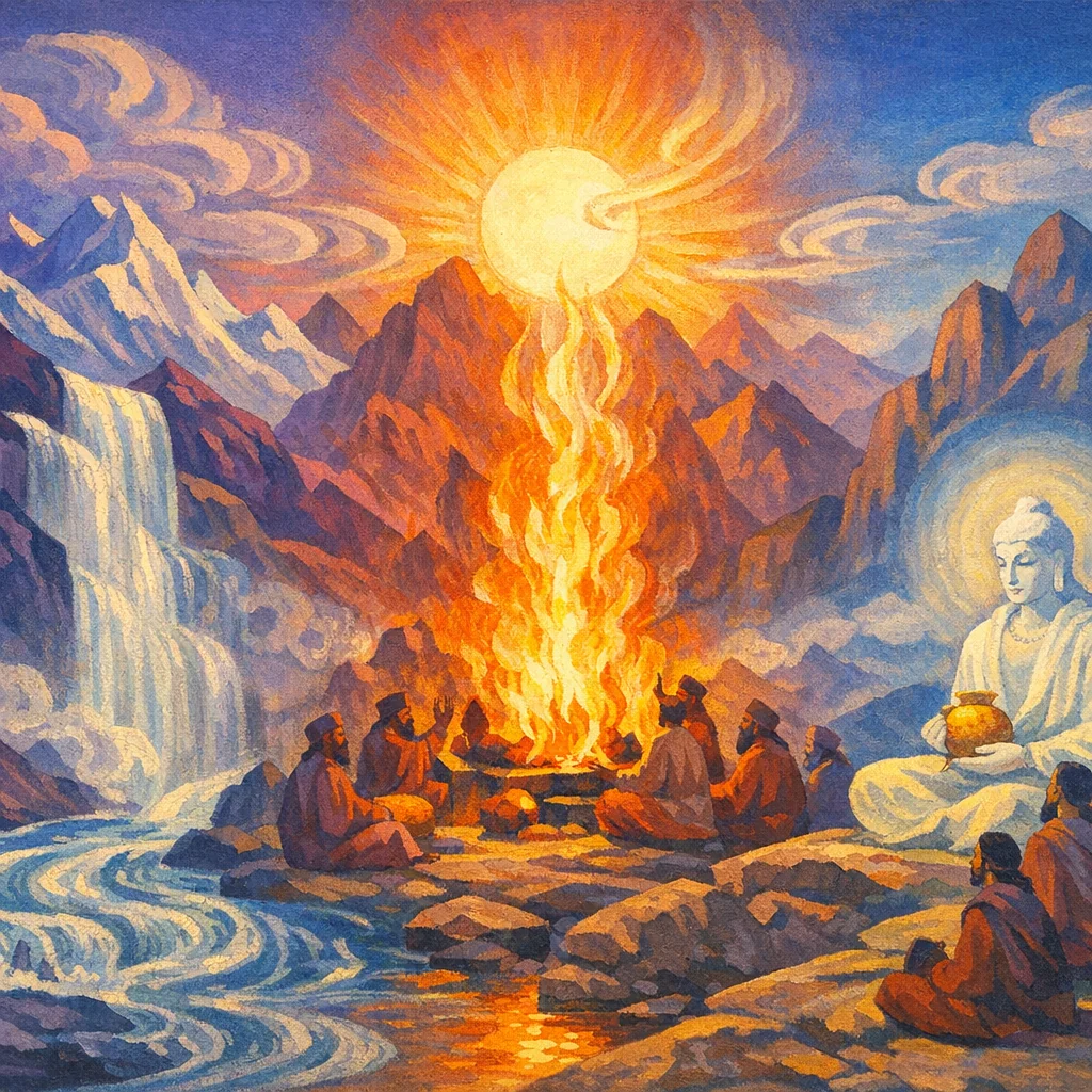 Soma Pavamāna is Soma “while being purified”—the pressed juice flowing through the filter, praised as a living, luminous power that strengthens and inspires.