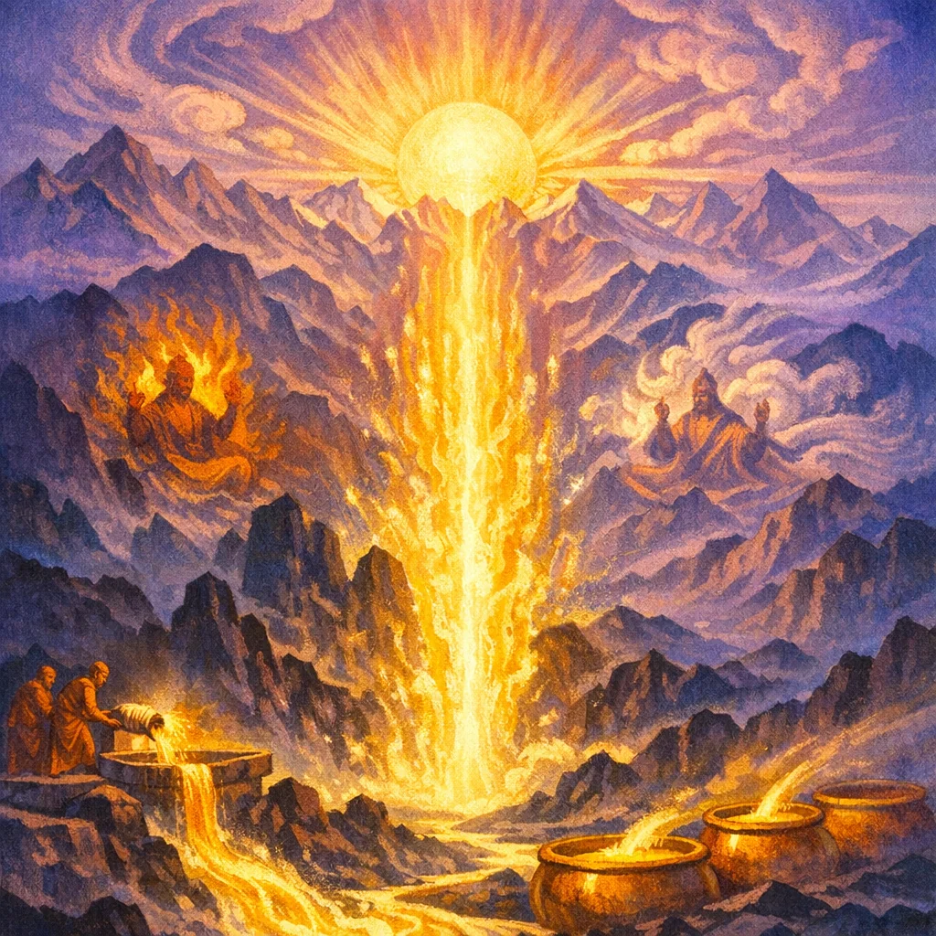 He, the purifying Soma, kindled the shining forth upon the ridge of Trita; with the kindred powers he brought the Sun into manifestation.