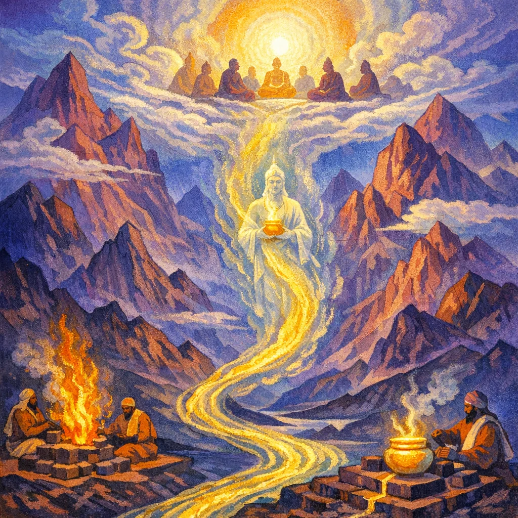 This short Pavamāna hymn celebrates Soma as the swift, self-luminous stream that is purified through the filter and carried to the divine plane where the gods affirm the eternal Reality. It depicts Soma’s descent and outpouring like a mighty river-wave, and culminates in his enthronement in the ‘womb of Ṛta’—the ordered truth that sustains sacrifice and cosmos.