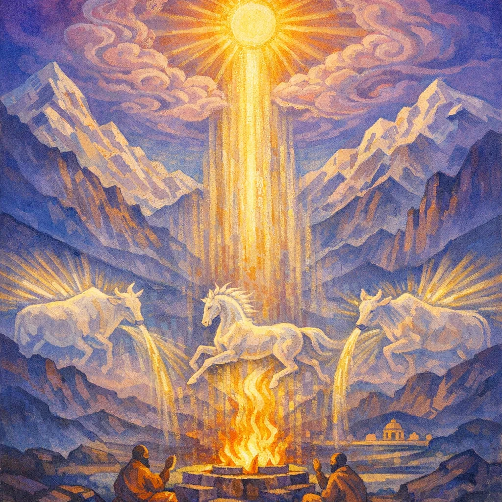 This short Pavamāna Soma hymn celebrates Soma as he is purified in the filter, compared to a swift steed cleansed by the radiant “cows” (rays) and then adorned by the poets’ hymns. It asks the bright Indu to bring splendid wealth (rayi), many-radianced brilliance, and to empower the chanting seer with victorious strength and noble hero-energy (suvīrya).