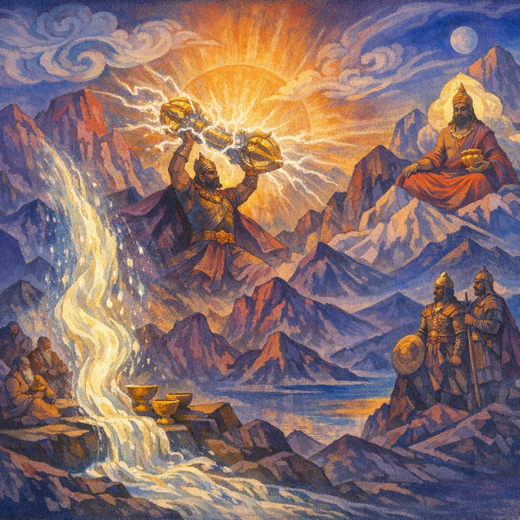 This short Pavamāna hymn celebrates Soma as he is purified and made fit for offering, growing in might through “right-doing” and surging forth with invigorating power. It highlights Soma’s capacity to generate Indra’s heroic energy (indriya) and even the thunderbolt-like force that arises when praise is born, while also portraying Soma as a bestower of wealth and victory in contests.