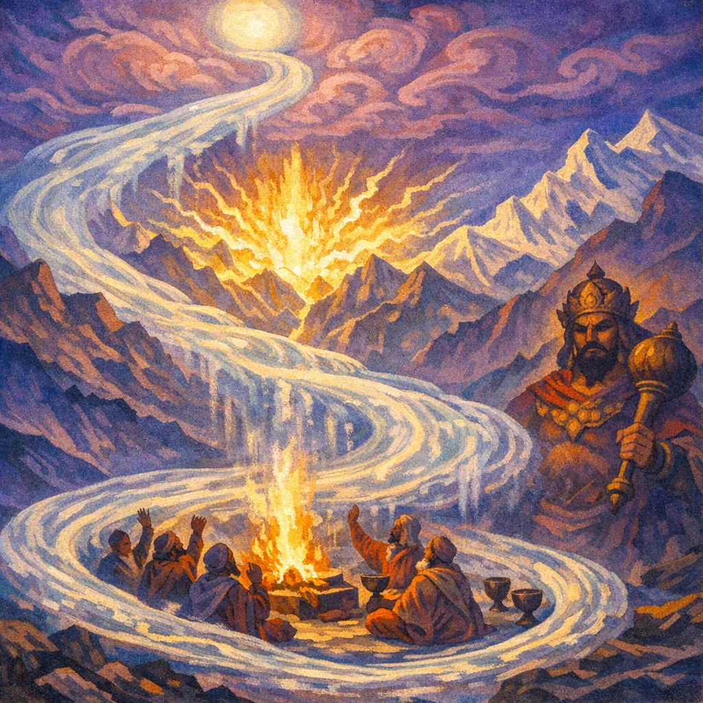 RV 9.61 is a Pavamāna Soma hymn that celebrates Soma’s flowing purification through the filter, invoking him to descend with abundant currents of power and to fill the sacrificers with inspired ecstasy (mada). As Soma clarifies, he is praised as a bringer of vast light—likened to heavenly lightning and the great Vaiśvānara radiance—while also being invoked as a fierce protector who wards off slander and hostile negation.