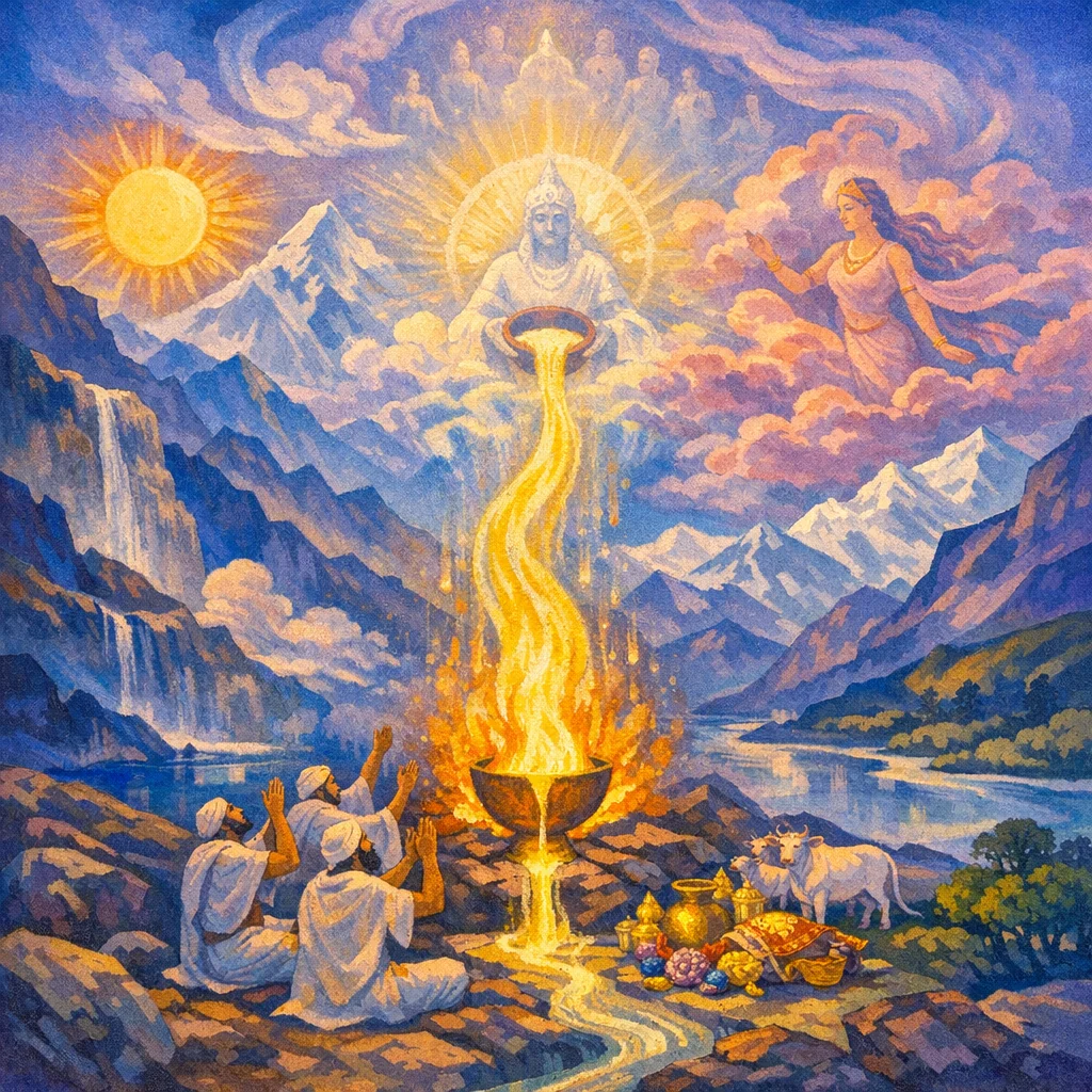 Flow forth toward us with the thousandfold Rayi—rich in rays of light and powers of swift force—and press forward also the Vāja, the plenitude of energy, and the fame that carries the soul’s victory outward.