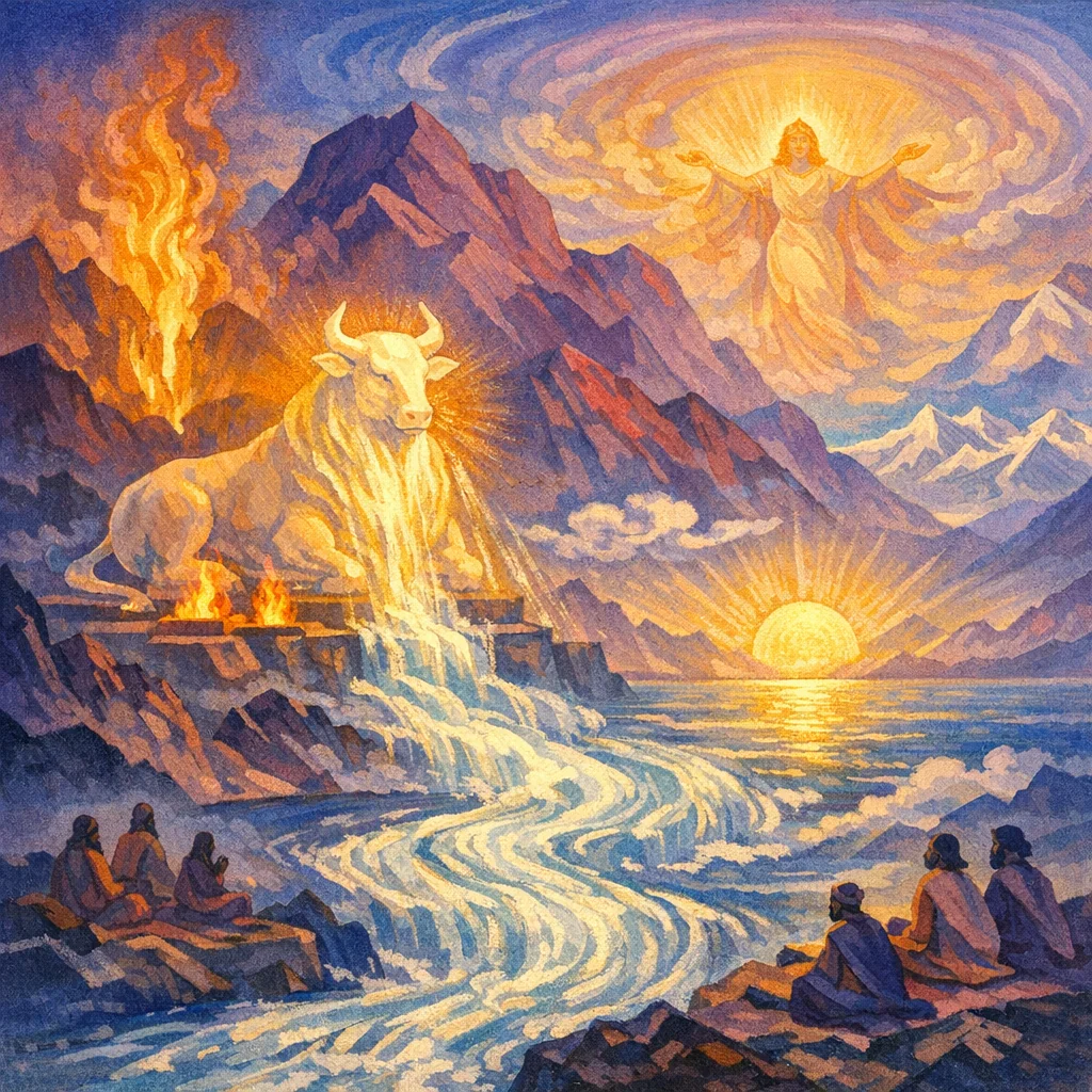 RV 9.64 praises Soma Pavamāna as he is pressed, filtered, and made radiant—an invigorating “bull” power that establishes ṛta (true order) and awakens clear vision. The hymn follows the movement of the Soma drops through purification toward their vast goal (the “ocean”), asking that this clarified delight become light, strength, and well-being for the sacrificers.