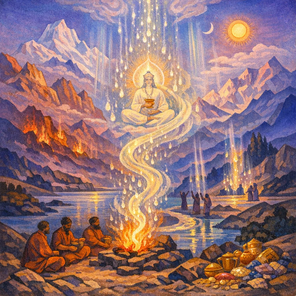 It is Soma in the act of purification—the pressed juice flowing and being strained, praised as a living, conscious power that becomes radiant and fit for offering.