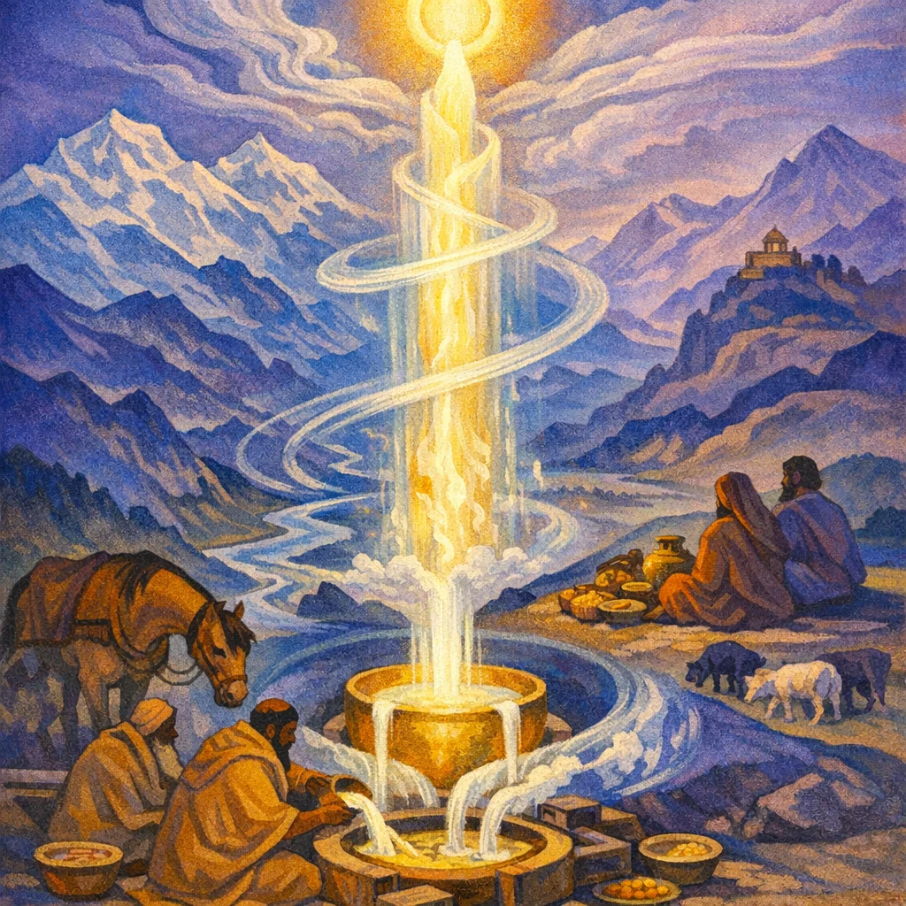As the navel of earth, as the firm support of the great heaven, set within the wave of the waters, within the rivers—Soma is poured. Indra’s thunderbolt, the bull of force, wide in riches, the lovely ecstasy flows purified in the heart.