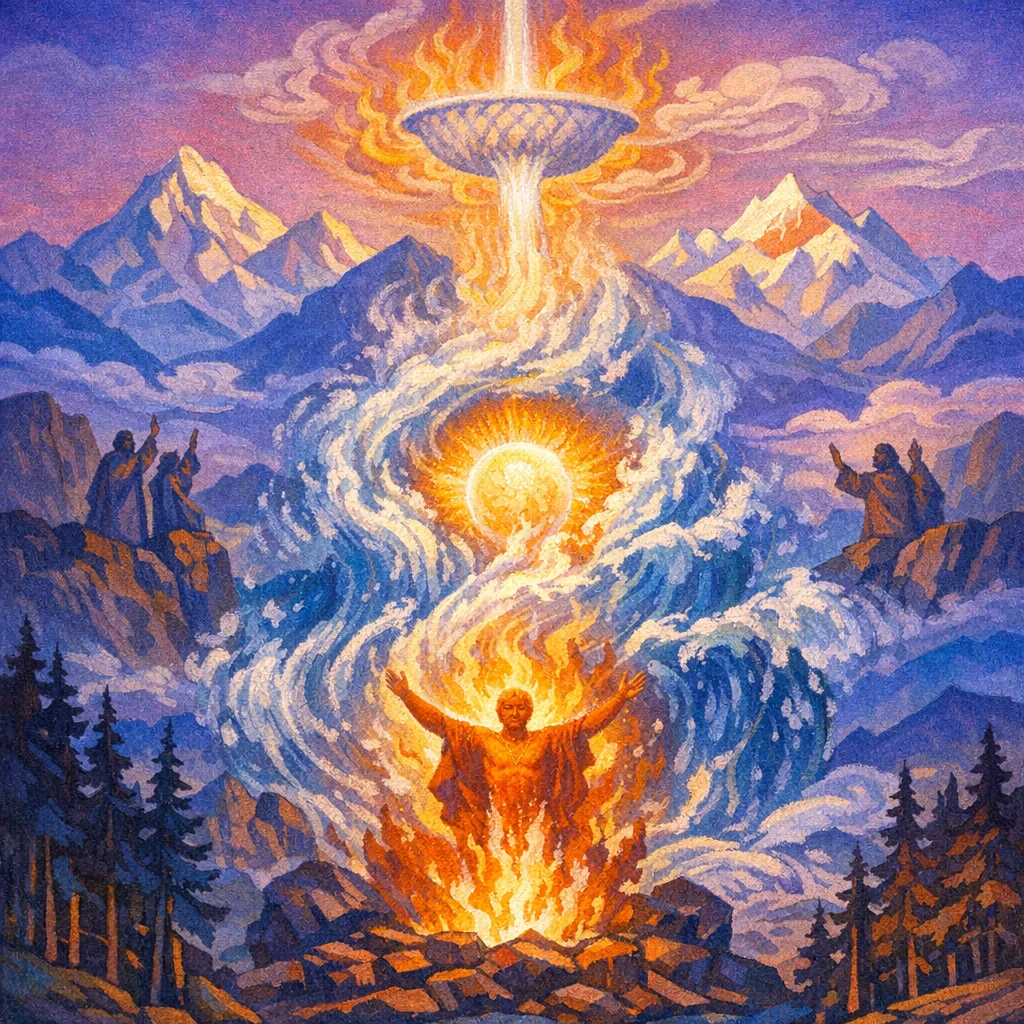 Down from the thousand-streamed source they have flowed unbroken; may they be in the third realm, rich in progeny. Four are the navels set as the supports of heaven; they bring the offering—immortal, dripping with clarified light.