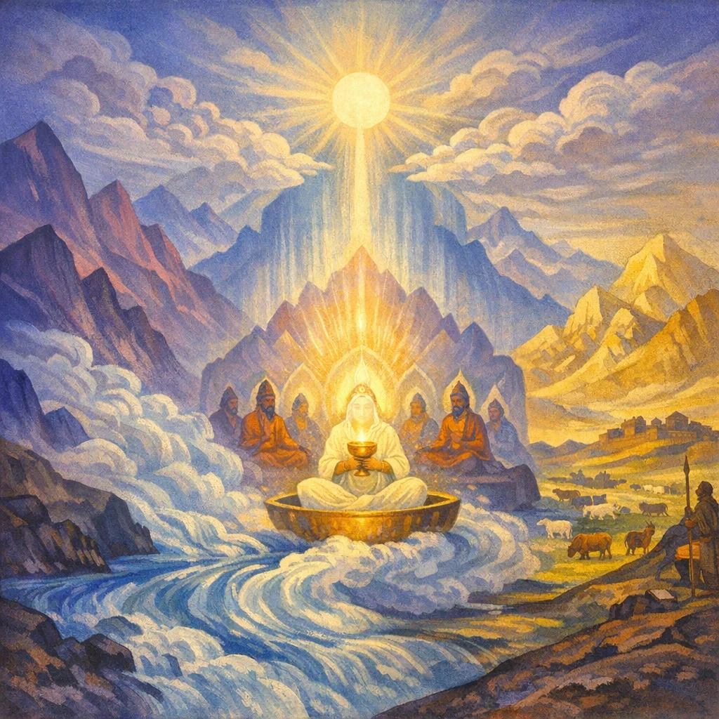 Our Soma flows as a winner of the Rays, a winner of the chariot of progress, a winner of the golden plenitudes, a winner of the luminous world, a winner of the waters, a winner of a thousand powers. The gods have fashioned him for drinking as ecstasy—the sweetest drop, ruddy with dawn-force, bringing delight and well-being.