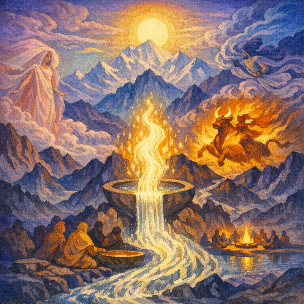This Soma Pavamāna hymn praises Soma as he is pressed, released, and purified into a radiant, thousand-streamed flow meant especially to exhilarate Indra and sustain the divine order. Soma is celebrated as the bull of ecstasy who repels life-diminishing forces, brings fame and strength, and moves like a river-wave through the waters toward the gods.