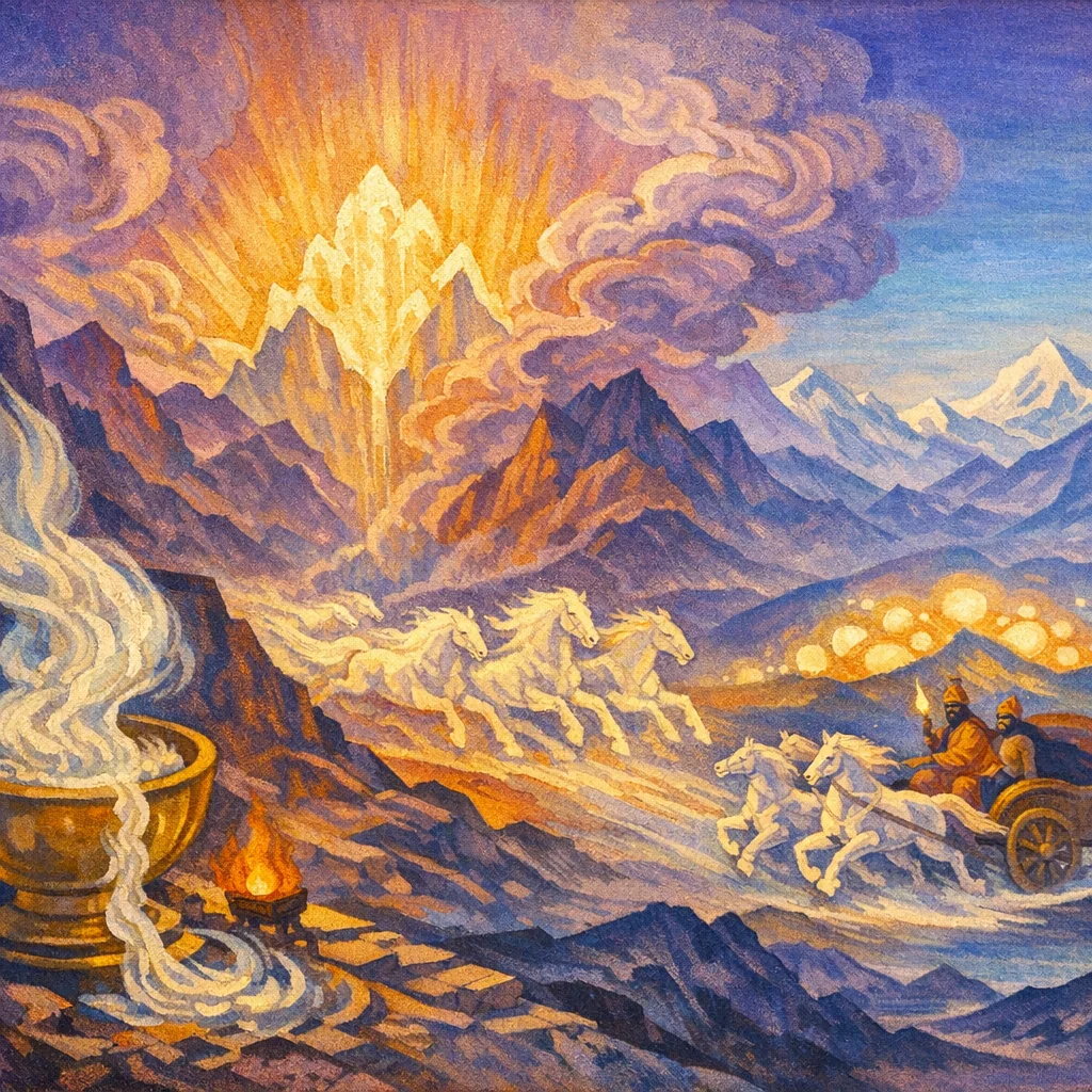 This Pavamāna Soma hymn celebrates Soma’s swift, purposeful flow as he is purified through the ritual filters and led to the sacred seat (barhis) like a well-groomed racehorse. The verses link Soma’s cleansing with the gaining of strength (vāja), fame (śravas), nourishment (iṣ), and immortality (amṛta), culminating in Soma’s companionship with Indra and a prayer for right praise and effective inspiration.