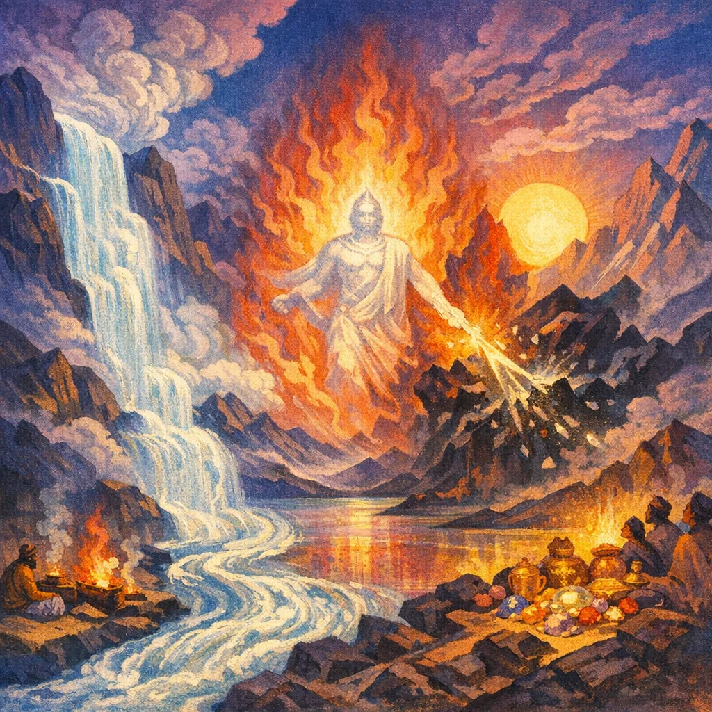 Forward he moves, the carrier of the flame-force, along the rightful paths; like the rain from heaven the purifying one streams out. Thousand-streamed, Soma settles down within us, in the mother’s lap, in the forest-growth, and comes to our field of being.