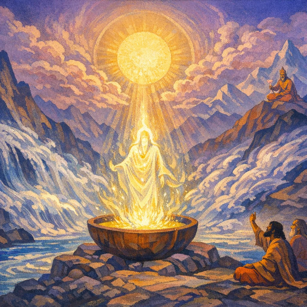 Like waves of waters rushing, the seeking inspirations surge toward Soma. Adoring, they come near, they gather, they enter—desiring him who desires (the offering and the ascent).