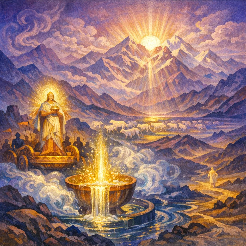 Purify yourself as the rain of heaven, hundred-streamed; winning a thousandfold plenitude of force in the gods’ finding. United with the rivers in the vessel, resounding, together with the shining lights, extend and secure our life—lengthening the soul’s term for the work of truth.
