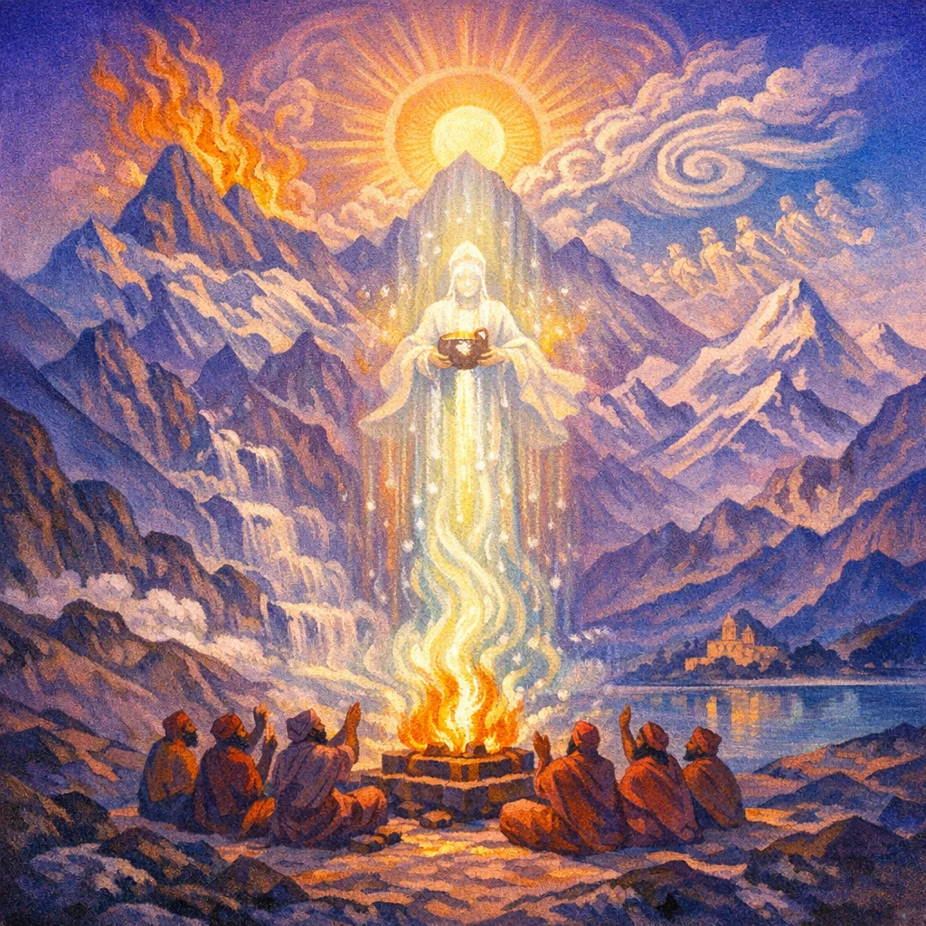 Pressed, Indu streams through the wool, his rapture not spilling away. The stream that rises upward in the rite goes like a shining one, seeking the luminous herds of light.